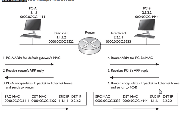 When the router receives the Ethernet frame, the router compares the frame to the MAC address on its Ethernet interface, which it matches. The router strips off the Ethernet frame and makes a routing decision based on the destination address of 2.2.2.2. In this case, the network is directly connected to the router’s second interface, which also happens to be Ethernet. In step 4, if the router doesn’t have PC-B’s MAC address in its local ARP table, the router ARPs for the MAC address of PC-B (2.2.2.2) and receives the response in step 5. The router then encapsulates the original IP packet in a new Ethernet frame in step 6, placing its second interface’s MAC address, which is sourcing the frame, in the source MAC address field and PC-B’s MAC address in the destination field. When PC-B receives this, it knows the frame is for itself (matching destination MAC address) and that PC-A originated the IP packet that’s encapsulated based on the source IP address in the IP header at layer 3.