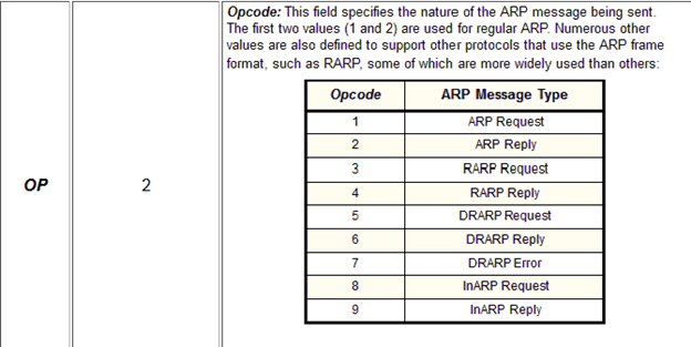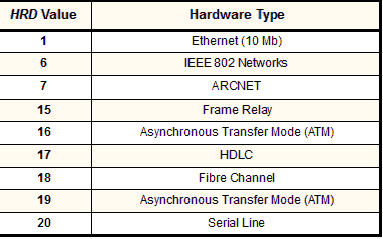 | PLN | 1 | Protocol Address Length: Again, the complement of the preceding field; specifies how long protocol (layer three) addresses are in this message. For IP(v4) addresses this value is of course 4. |