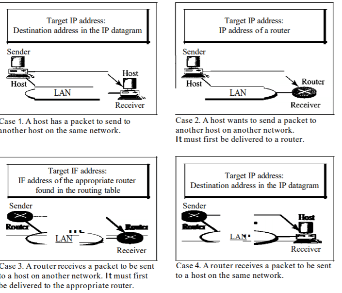 - The sender is a router that has received a datagram destined for a host on the same network. The destination IP address of the datagram becomes the logical address that must be mapped to a physical address.