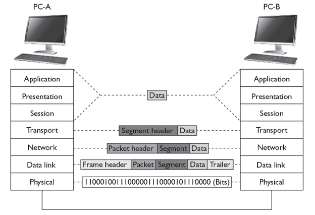 In this example, PC-A wants to send data to PC-B. Notice that each device needs to process information at specific layers