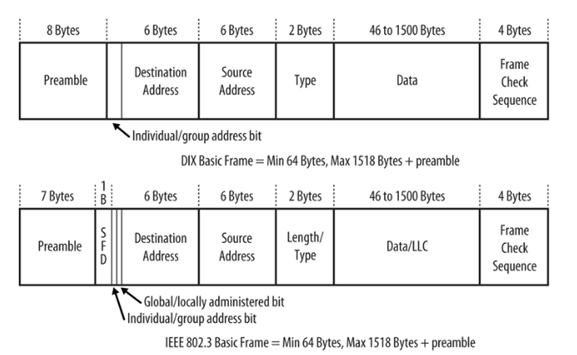 - Because the DIX and IEEE basic frames both have a maximum size of 1,518 bytes and are identical in terms of the number and length of fields, Ethernet interfaces can send either DIX or IEEE basic frames. The only difference in these frames is in the contents of the fields and the subsequent interpretation of those contents by the network interface software.