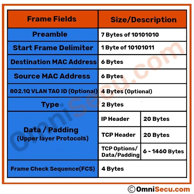 the minimum size of an Ethernet Frame must be 64 bytes (6+6+2+46+4) and maximum size of an Ethernet Frame 1,518 bytes (6+6+2+1500+4).