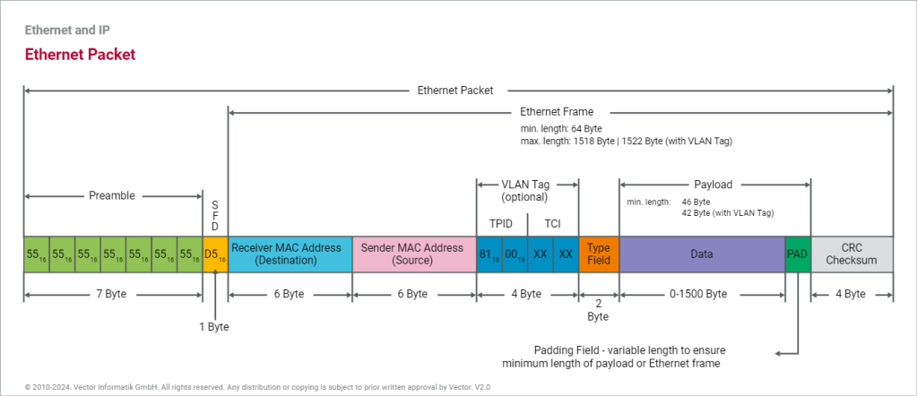The IEEE specifications define different formats for Ethernet frames. The automotive industry typically uses the Ethernet II frame, which can also contain information for VLAN as an extension. For this reason, a distinction is made between the basic MAC frame (without VLAN) and the tagged MAC frame (including VLAN).