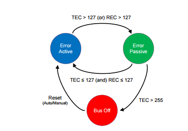 To confine serious errors, each ECU moves between three states as shown above: error active, error passive, and bus off. An ECU starts in error active mode. If either of its TEC or REC counters go above 127, it moves into the error passive mode. An error-passive node returns to error active once both of its TEC and REC counters fall below 128.
