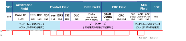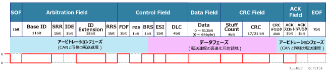 This is the bit that distinguishes between classical CAN and CAN FD frames. It is dominant in the classical CAN frame formats (CBFF and CEFF), and recessive in the CAN FD frame formats (FBFF and FEFF). The FDF bit is not always transmitted in the same time slot. In the Base frame formats (CBFF and FBFF) the FDF bit is transmitted in the control field just after the IDE bit. Because the arbitration field is extended in frames with 29-bit identifiers (CEFF and FEFF), the FDF bit is transmitted after the RTR or RRS bits respectively in extended frame formats. This keeps it in the control field, so it is never included in arbitration.