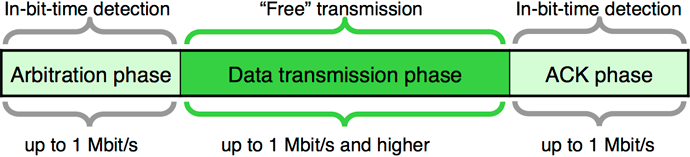 On the other hand, after arbitration there’s an “empty highway” – enabling high speed during the data transmission (when there is just one node driving the bus-lines). Before the ACK slot – when multiple nodes acknowledge the correct reception of the data frame – the speed needs to be reduced to the nominal bit-rate.
