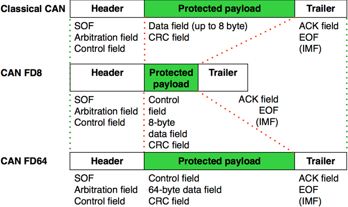 There are three main differences between CAN FD and Classical CAN: Bit Rate Switching (BRS); maximum size of the data payload; the coverage of the CRC.