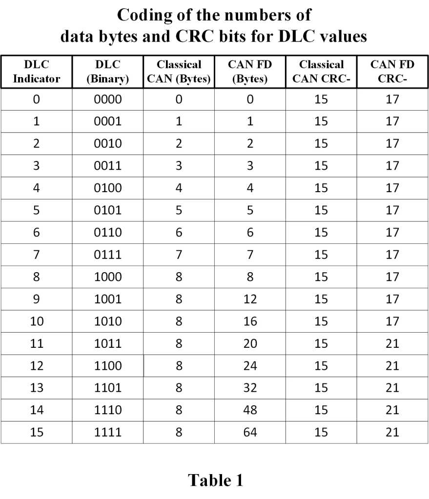 Classical CAN frames can transmit between zero and eight bytes of data in the Data phase. Eight bytes is the maximum amount of data, sometimes referred to as the maximum data payload, in a Classical CAN frame. CAN FD increases this maximum payload to sixty-four (64) bytes. This significant increase in data payload enables CAN FD to be so much more efficient than classical CAN. There is one catch with this increase. In both classical CAN and CAN FD there are four control bits, called Data Length Code (DLC), that indicate the size of the data payload. The first eight bytes of data are mapped one-to-one to the DLC value, so the DLC directly indicates the number of data bytes in the data phase if there are zero to eight bytes of data. When you get above eight bytes of data in the frame, you must use a standard size frame, and the size is no longer directly mapped to the DLC value on a one-to-one basis. The table below will make this clear and shows the relationship between DLC and the size of the data payload for both Classical CAN and CAN FD.