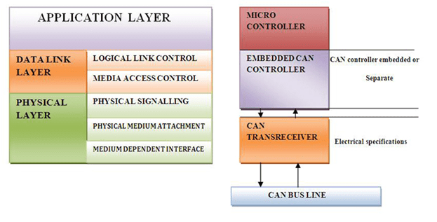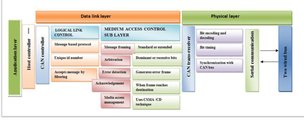The concept of the CAN protocol can be understood using the figure above. Every node has a Host controller also known as micro-controller which is a small and low-cost computer .Host controller implements application layer of OSI model. Micro-controller gathers information from other electronic control units like braking, steering, power windows etc. to communicate with other nodes and transfers it to CAN controller. CAN controller incorporate logical link control and MAC medium access control of data link layer. LLC allows filtering of messages by using unique ID on each message then MAC sub layer frames the message. Once, framing is done it is followed by arbitration, error detection and acknowledgement that all comes under MAC sub layer of data link. The frame is transferred to CAN trans-receiver, for encoding and decoding. Finally CAN trans-receiver synchronizes with the CAN bus to send the message to anther node.