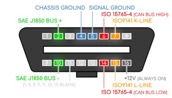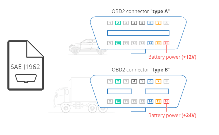 The OBD2 standard (SAE J1962) specifies two female OBD2 16-pin connector types (A & B). Below is an example of a Type A OBD2 pin connector (also sometimes referred to as the Data Link Connector
