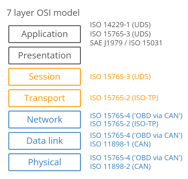 In particular, ISO 15765-4 describes the physical, data link layer and network layers, seeking to standardize the CAN bus interface for external test equipment. ISO 15765-2 in turn describes the transport layer (ISO TP) for sending CAN frames with payloads that exceed 8 bytes. This sub standard is also sometimes referred to as Diagnostic Communication over CAN (or DoCAN). See also the 7 layer OSI model illustration.