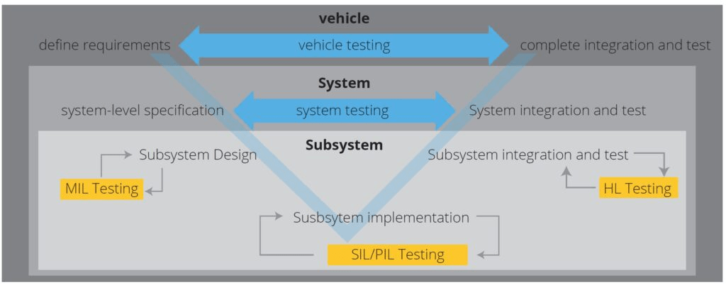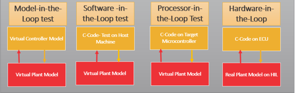 MIL, SIL, PIL, and HIL testing come in the verification part of the Model-Based Design approach after you have recognized the requirement of the component/system you are developing and they have been modeled at the simulation level (e.g. Simulink platform). Before the model is deployed to the hardware for production, a few verification steps take place which are listed below.